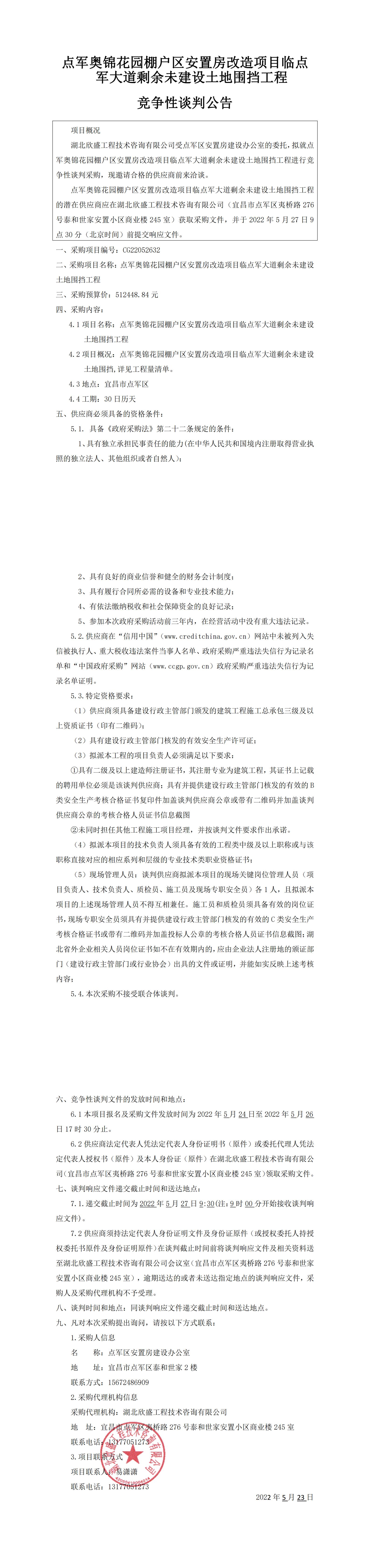 點(diǎn)軍奧錦花園棚戶區(qū)安置房改造項(xiàng)目臨點(diǎn)軍大道剩余未建設(shè)土地圍擋工程競(jìng)爭(zhēng)性談判公告