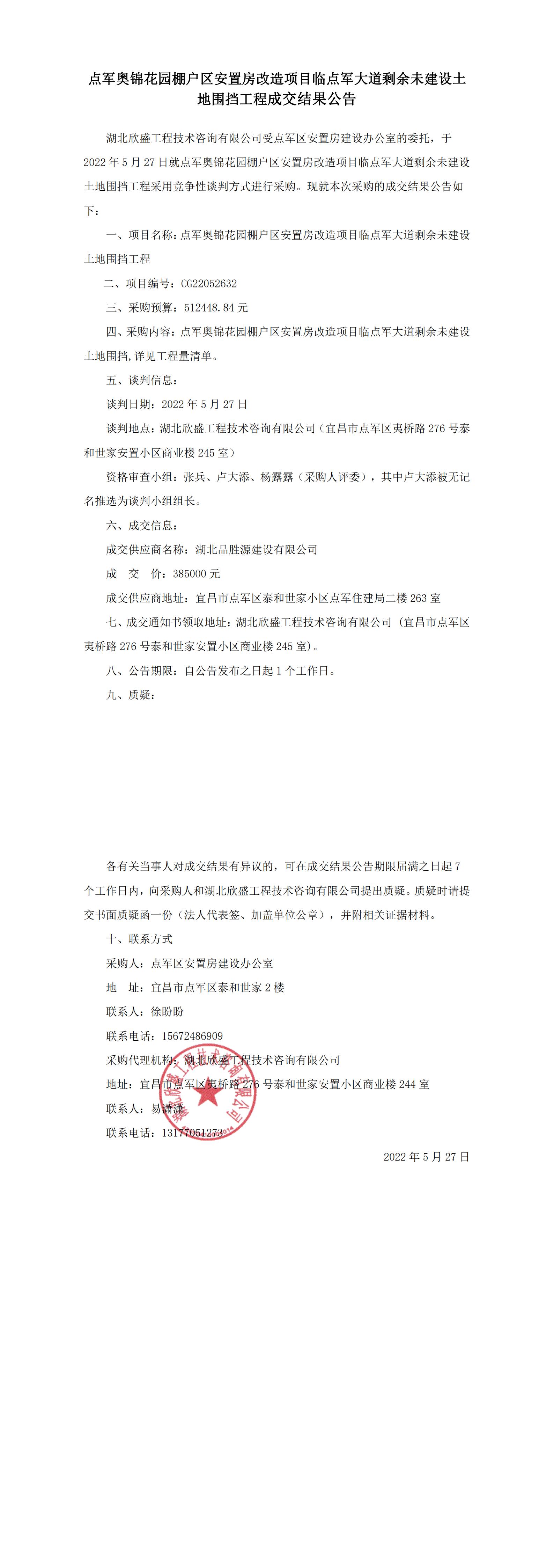 點軍奧錦花園棚戶區(qū)安置房改造項目臨點軍大道剩余未建設土地圍擋工程成交結果公告