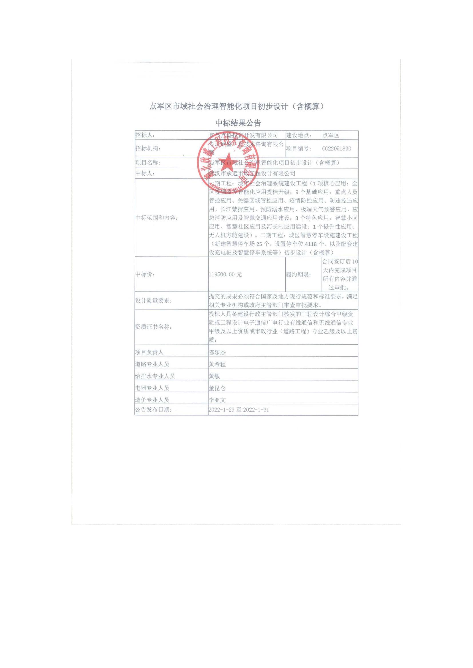點(diǎn)軍區(qū)市域社會(huì)治理智能化項(xiàng)目初步設(shè)計(jì)(含概算)中標(biāo)結(jié)果公告