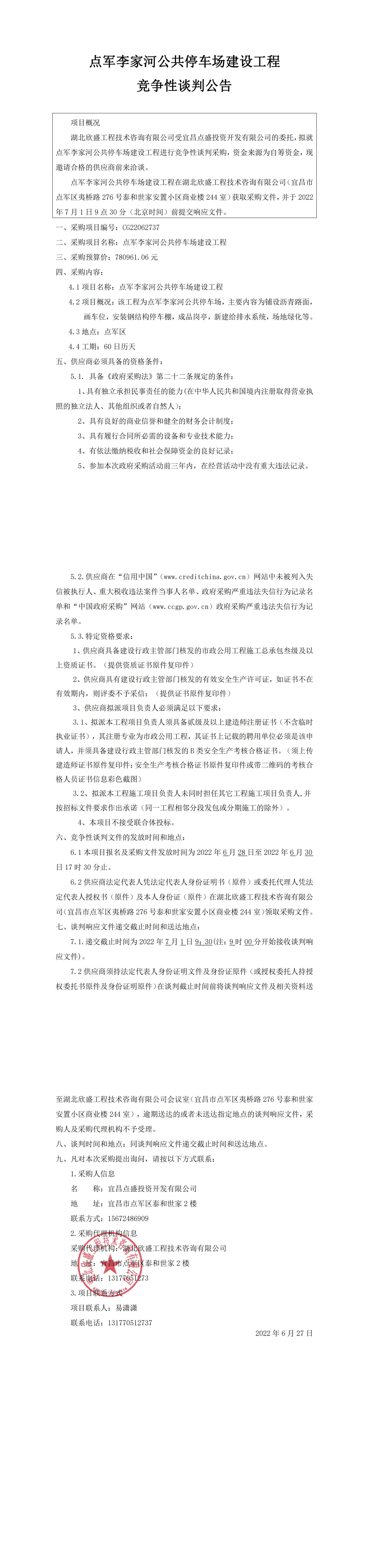 點(diǎn)軍李家河公共停車場(chǎng)建設(shè)工程競(jìng)爭(zhēng)性談判公告