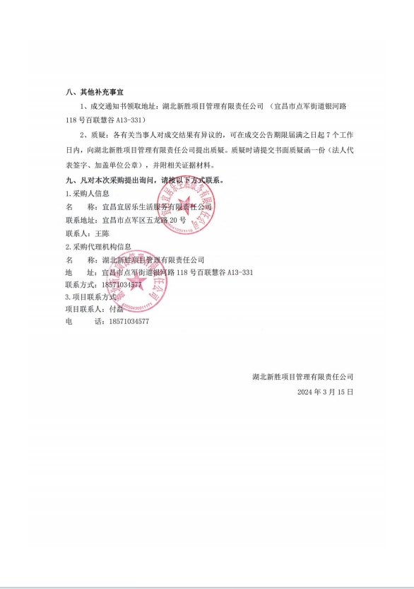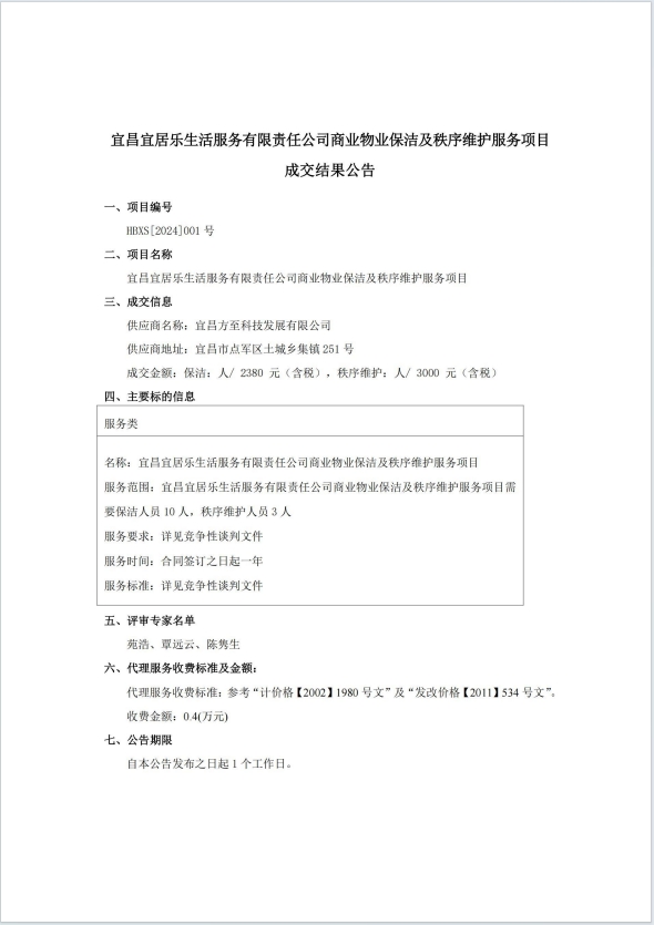 宜昌宜居樂生活服務有限責任公司商業(yè)物業(yè)保潔及秩序維護服務項目成交結(jié)果公告