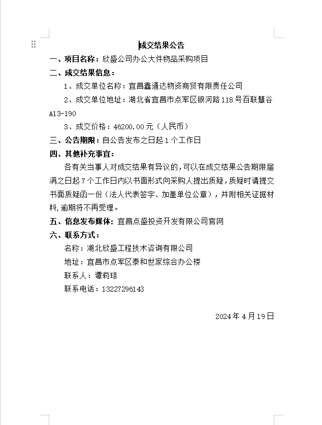 欣盛公司辦公大件物品采購項(xiàng)目成交公告
