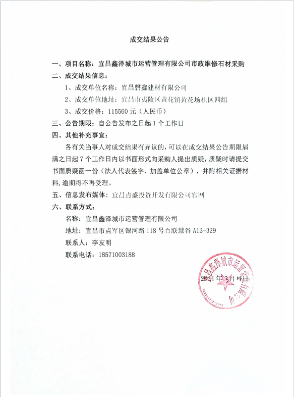 宜昌鑫澤城市運(yùn)營管理有限公司市政維修石材采購項(xiàng)目成交公告