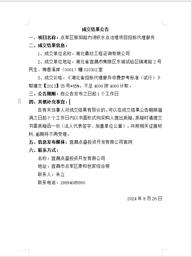 點軍區(qū)紫陽路內(nèi)澇積水點治理項目招標(biāo)代理服務(wù)成交公告