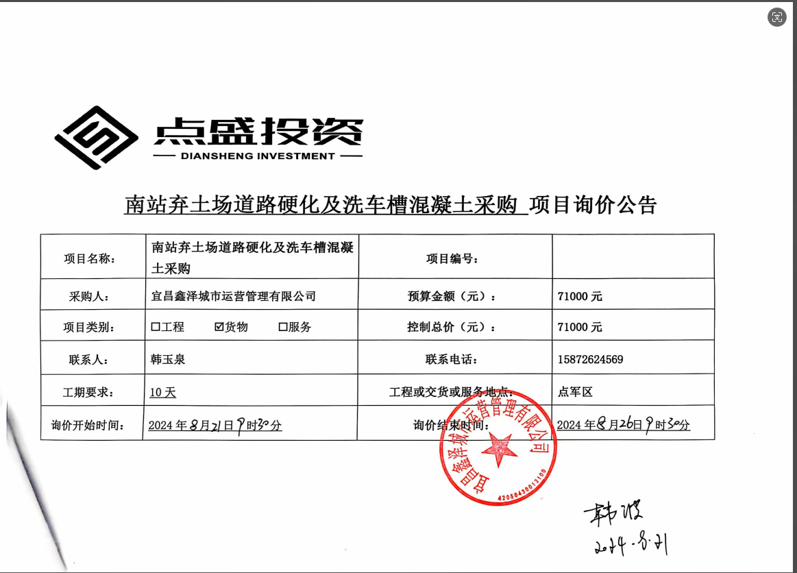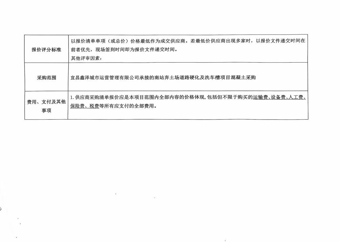 宜昌鑫澤城市運(yùn)營(yíng)管理有限公司南站棄土場(chǎng)道路硬化及洗車槽混凝土采購(gòu)項(xiàng)目詢價(jià)公告