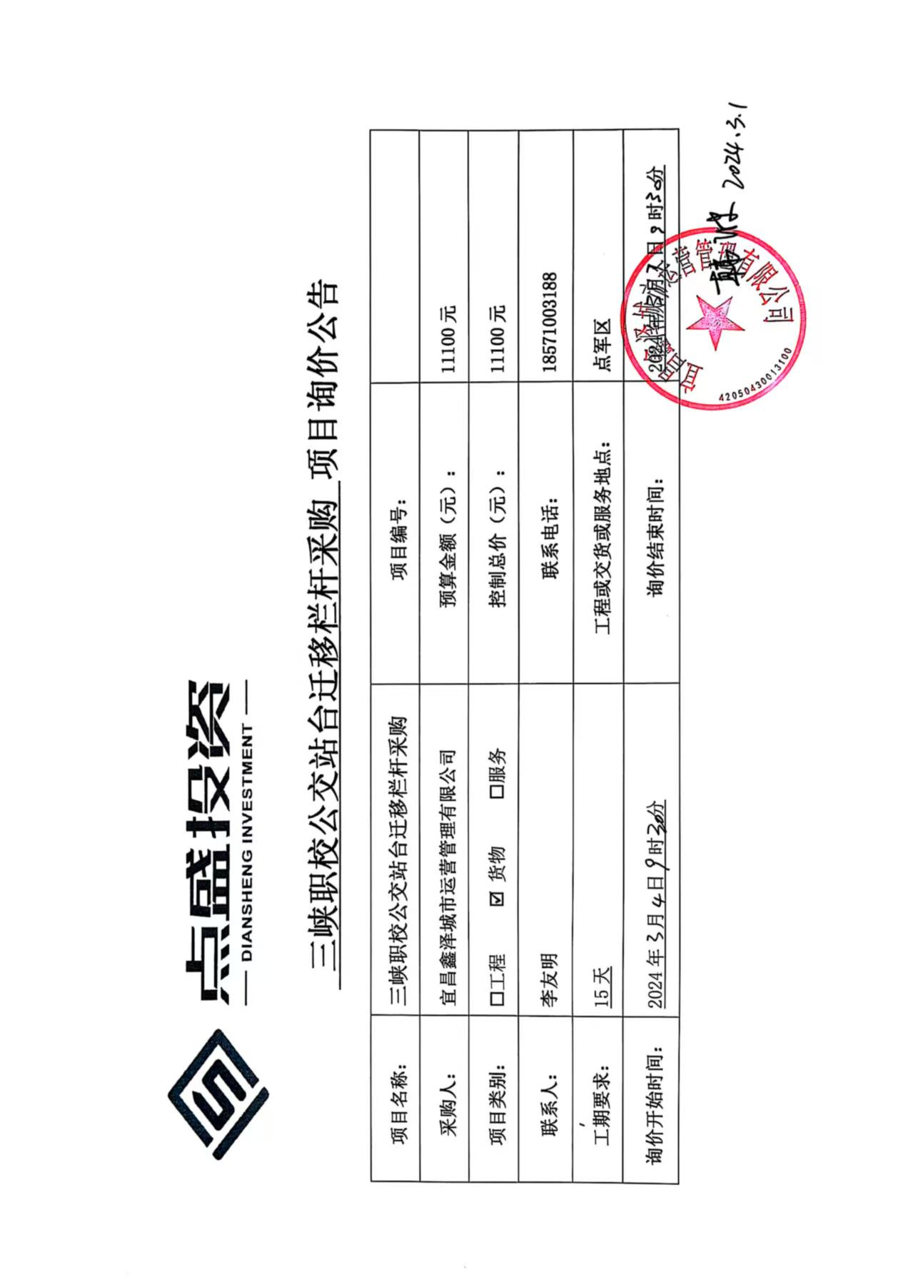 三峽職校公交站臺(tái)遷移欄桿采購(gòu)詢價(jià)公告